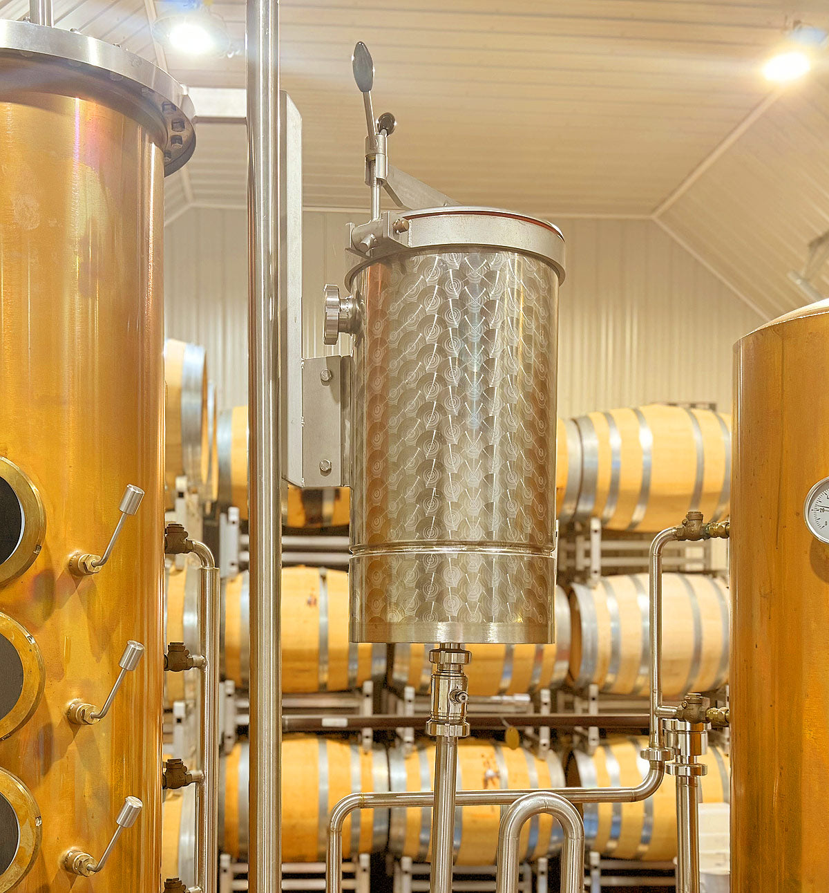 Herbs and spices are what differentiate our Gins and Pastis from our other spirits.When producing these our still is reconfigured to have our stainless steel botanical vessel between the still and condenser.